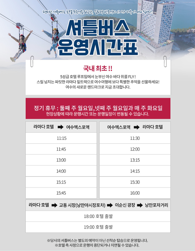 하늘을 가르며 바다 위를 달리는 스릴, 그리고 그 너머로 펼쳐지는 여수의 푸른 풍경. 여수 해상 짚트랙은 감성, 모험, 자연이 어우러진 완벽한 여행 한 장면이 되어줄 것입니다.